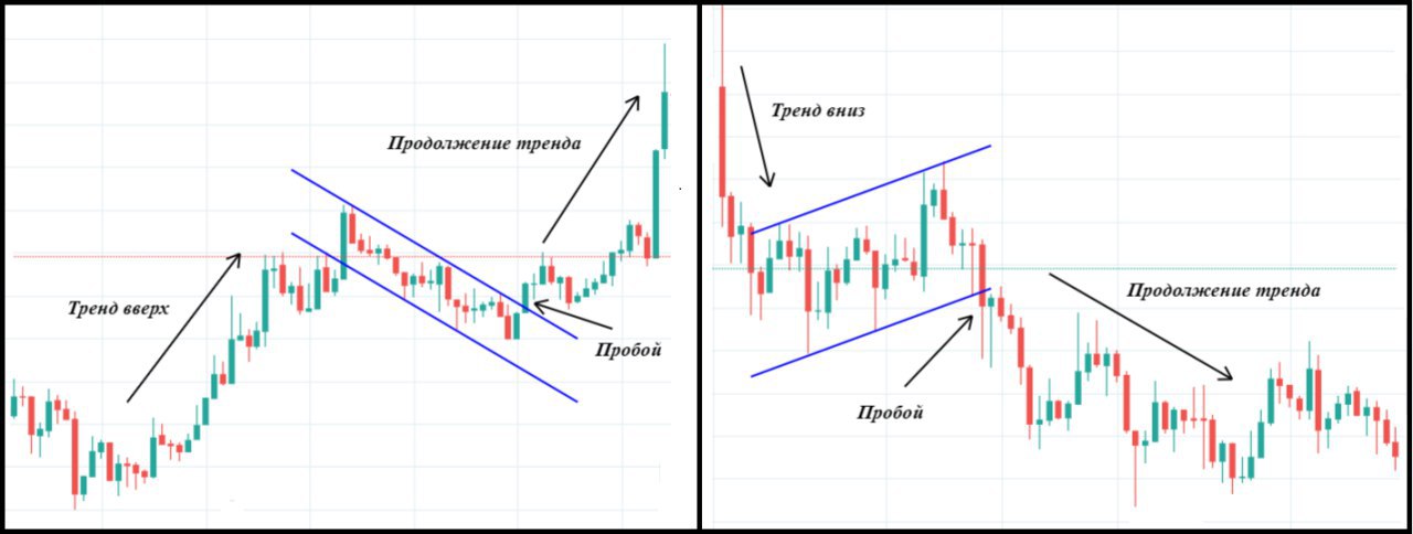 Флаги могут быть разных форм и размеров, но все они представляют собой модели продолжение текущего тренда. Если рынок движется вверх и формируется флаг, скорее всего, в скором времени случится пробой в сторону импульса. Противоположное относится к нисходящему тренду.