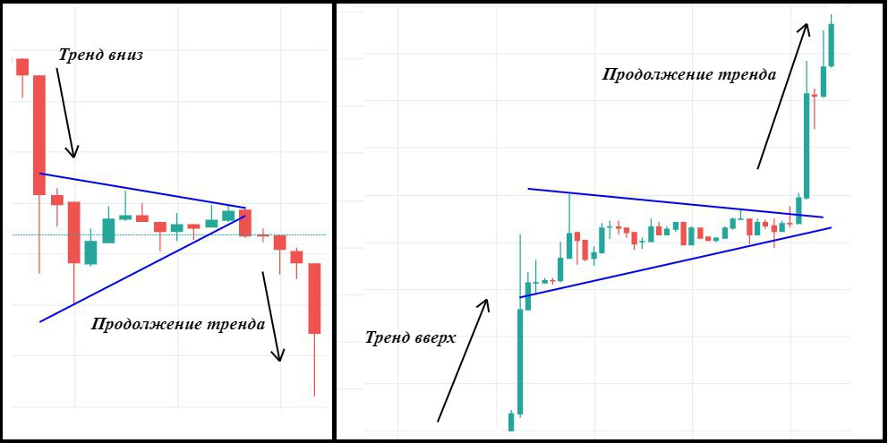 ▪️Теперь наоборот, падающий клин в восходящем тренде. Это, как правило, сигнал на его продолжение. Сильный тренд вверх, цена долго сомневается, но лишь чтобы продолжить этот тренд.
