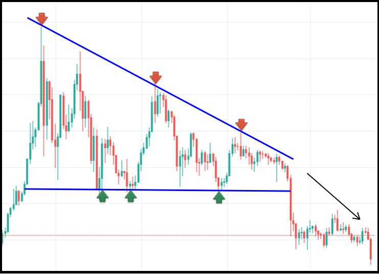Продолжаю рубрику #ОсновныеФигурыТехническогоАнализа и сегодня хотел бы рассказать Вам о фигуре - Нисходящий треугольник.