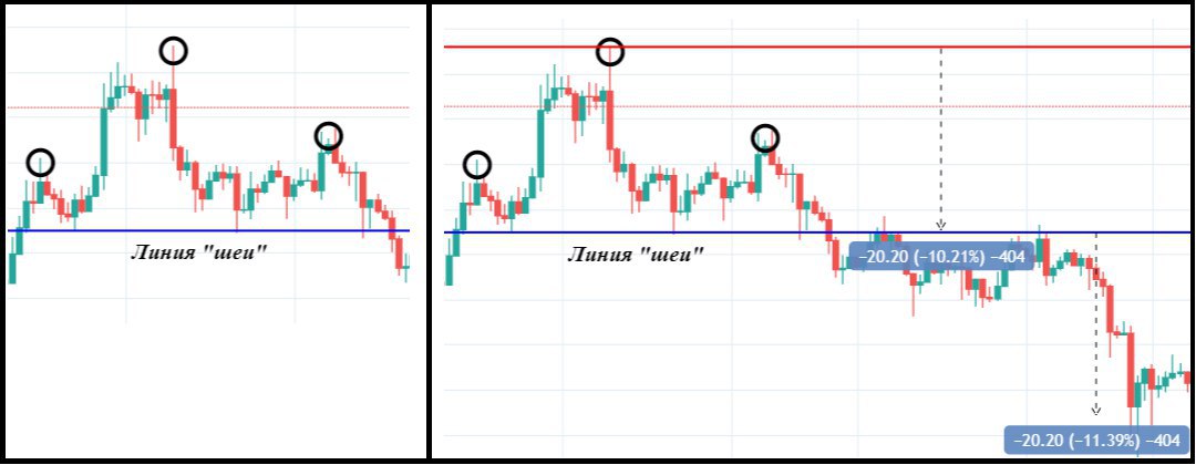Как видите, мы снова размер фигуры сопоставляем с дальнейшим движением цены, 1:1. Измерение потенциального расстояния поможет вам более уверенно использовать такие фигуры. Именно так имеет смысл рассчитывать влияние головы и плеч.