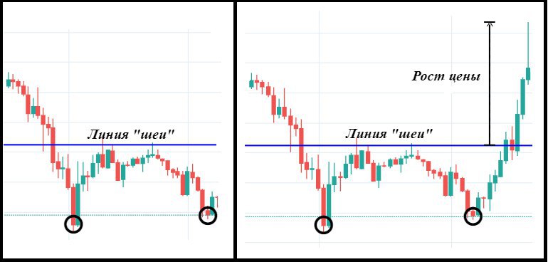 Перевернутая Голова и Плечи — это тоже самое , что Голова и плечи, только в профиль.В данном случае три вершины вывернуты наизнанку и представляют собой, фактически, три дна, где одно ниже двух других.
