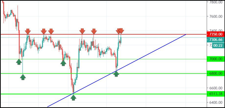 Как мы видим, в данный момент линией сопротивления служит уровень 7300-7400$ (7350$), именно оттуда продавцы не пускают цену на вверх