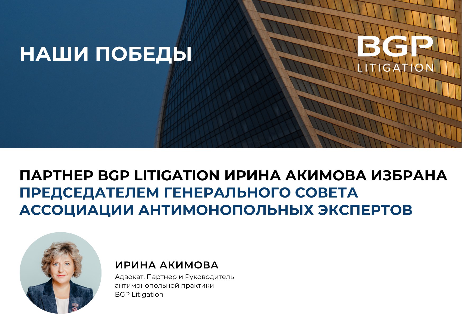 ПАРТНЕР BGP LITIGATION ИРИНА АКИМОВА ИЗБРАНА ПРЕДСЕДАТЕЛЕМ ГЕНЕРАЛЬНОГО СОВЕТА АССОЦИАЦИИ АНТИМОНОПОЛЬНЫХ ЭКСПЕРТОВ