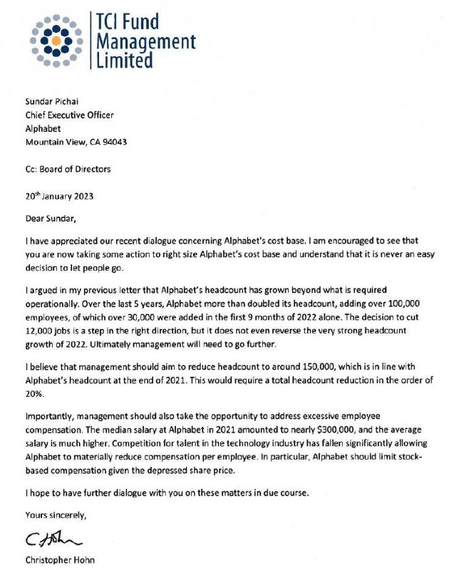 В сеть утекло письмо Кристофера Хона — ему принадлежит доля в $6 млрд в Alphabet. Исходя из текста письма - волна массовых сокращений в Google продолжится, а зарплаты порежут.