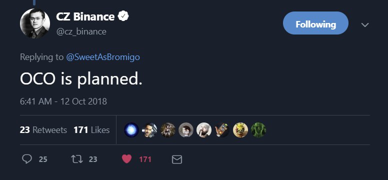 Отличные новости! По заявлению CEO Binance Чанпена Чжао, планируется ввести OCO ордера на биржу. Это означает, что мы сможем выставлять стоп-лосс и тейк-профит ордера одновременно. Как раз то, чего нам так не хватало!