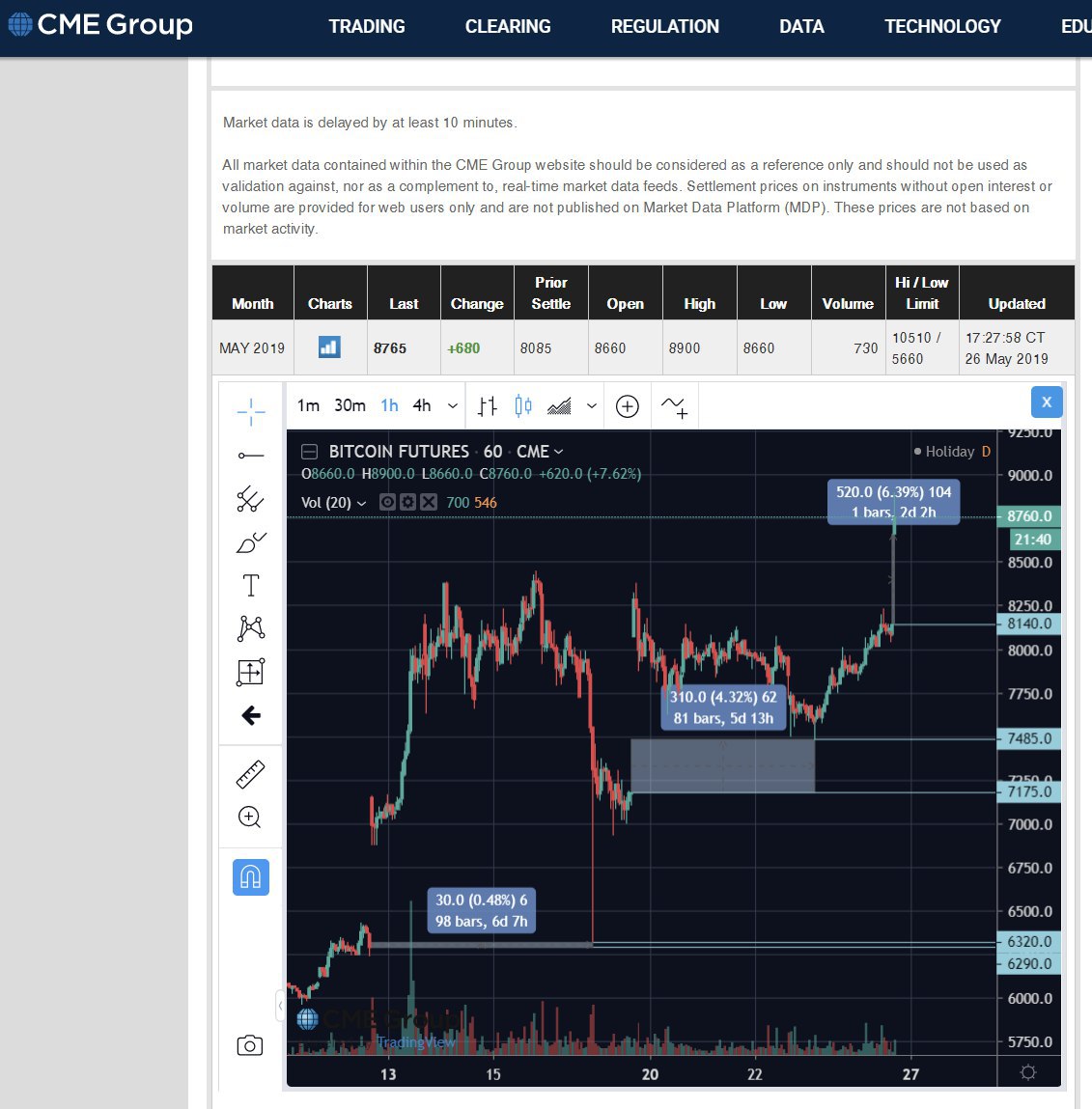 Все неперекрытые ГЭПы на майском фьючерсе биткоина на бирже СМЕ.