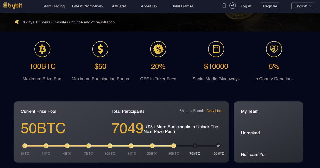 До окончания регистрации в конкурсе на бирже Bybit осталось 13 часов. Призовой фонд разогнали до 50-ти битков, а это половина от максимально возможного. Совмневаюсь, что за последние часы добьют до сотни, но 70 битков - вполне реально!