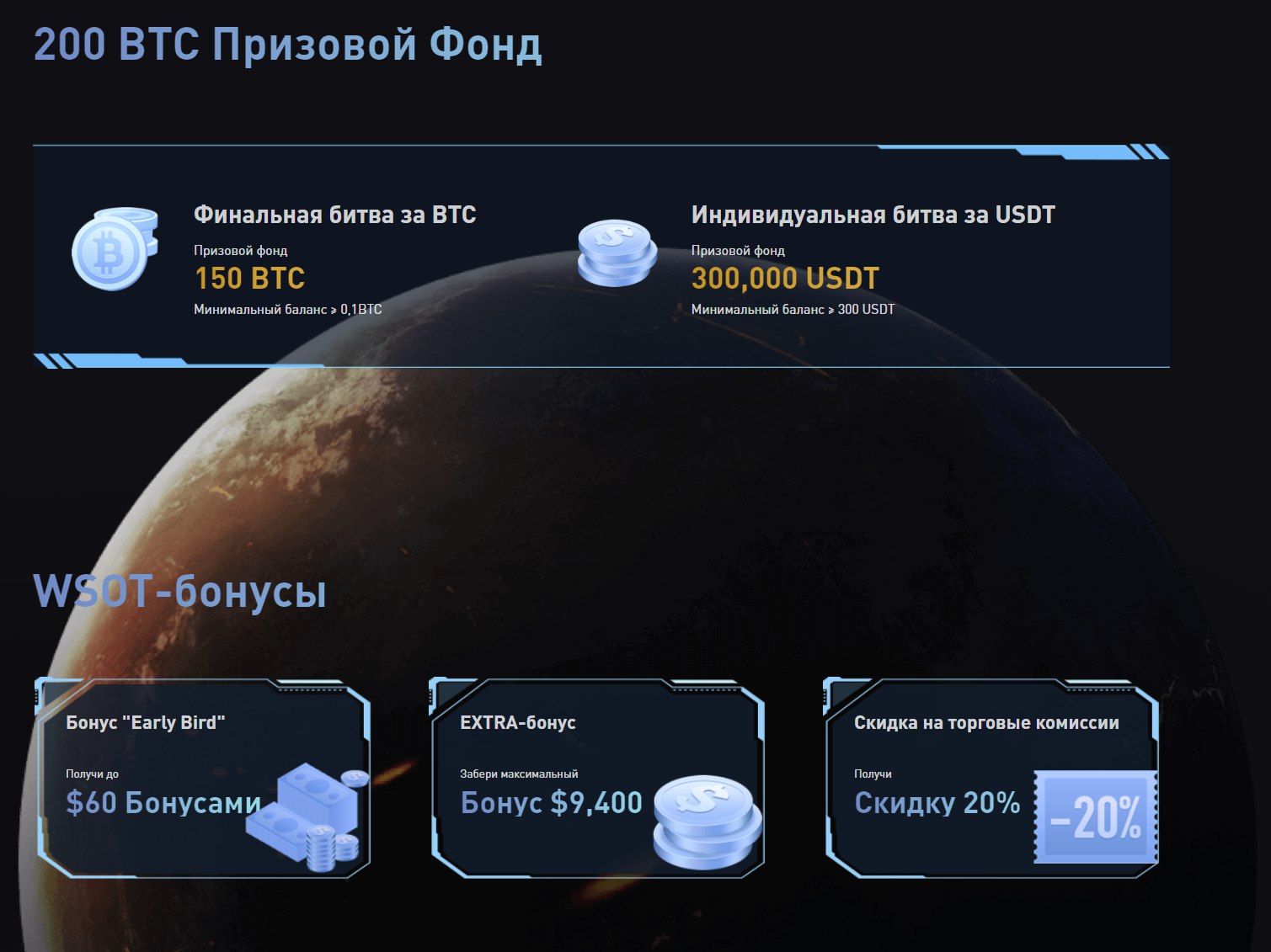 Всего будет два пула - командный (150 BTC) и индивидуальный ($300,000), а также интересный интерактив во время состязания с дополнительными бонусами ("планета WSOT").