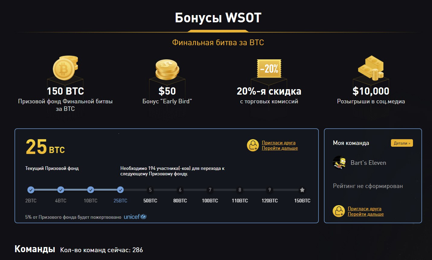 Напоминаю, что для участия в основном командном зачёте необходимо исеть 0.1 BTC на счету, а для индивидуального - $300.