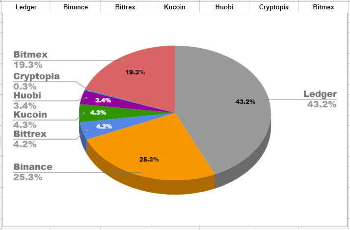 Планирую немного увеличить доли Kucoin и Huobi. Криптопию скорее всего удалю из списка, так как не торгую там вовсе. На счет Биттрекса думаю еще. Что-то я к ней остыл. Новые альты там появляются в последнюю очередь, комиссии конские, новый интерфейс вообще на зашёл... Вполне вероятно, что тоже уйду с неё.