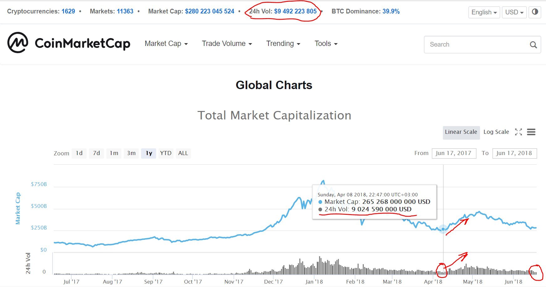 Сегодня суточный объем торгов упал ниже $10 млрд, впервые с 8-го апреля этого года. А до этого такой низкий показатель был только в прошлом году. Суточная волатильность биткоина упала до минимума.