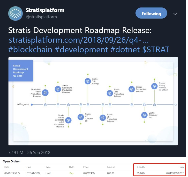 После твита о выходе обновлённого роадмэпа по Стратису решил его прикупить по рыночной цене на 0.05 битка (15% депо) по 24630 сатоши. Пока думаю, как делать посты быстрее, т.к. иногда в таких случаях цена может улететь вверх достаточно быстро.