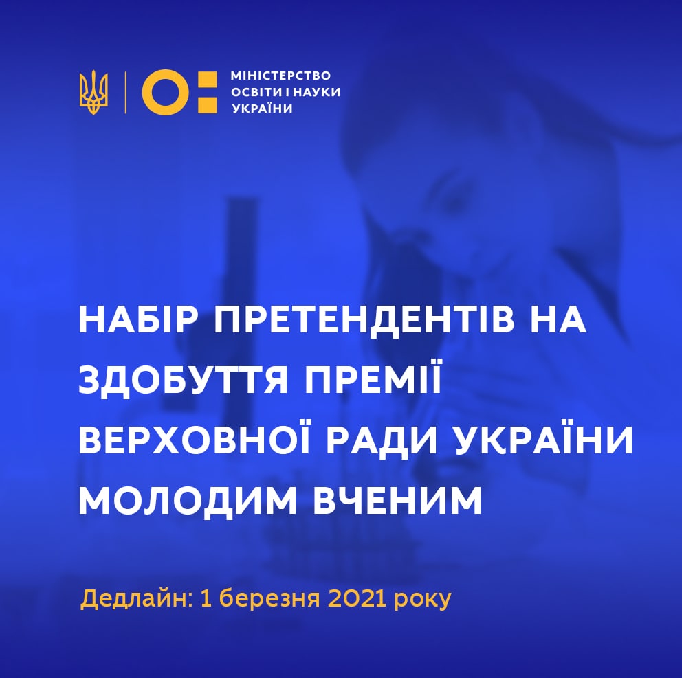 Міністерство освіти і науки України проводить набір претендентів на здобуття Премії Верховної Ради України молодим вченим. Прийом документів триватиме до 01 березня 2021 року.