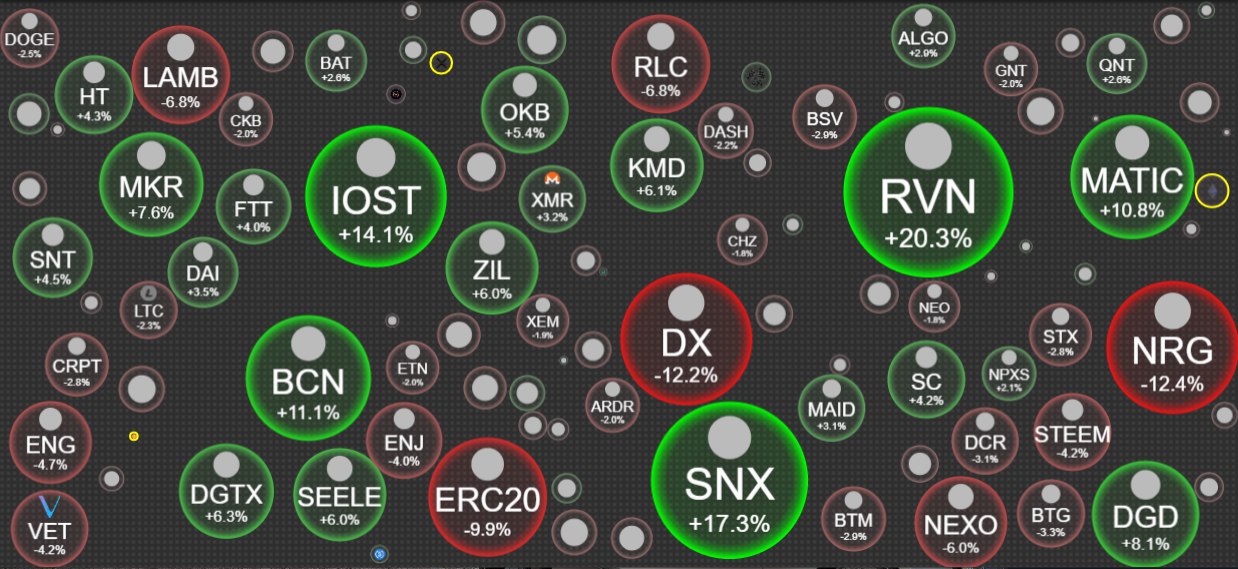 Лидеры роста: RVN +20%, SNX +17%, IOST +14%.