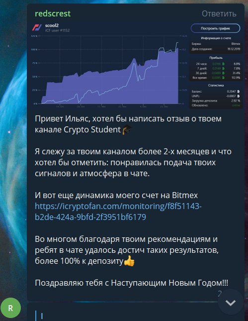 📌 Получил отзыв от подписчика - redscrest, думаю все его знают в чате, как отличного трейдера и хорошего человека.