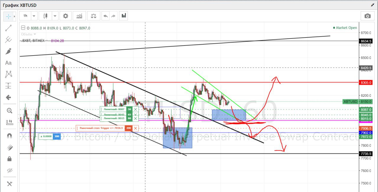 Двигаемся в клине, думаю сегодня будет ретест 8000$, как и говорил ранее, главное удержать и дать отскок на уровень 8300-8400$.