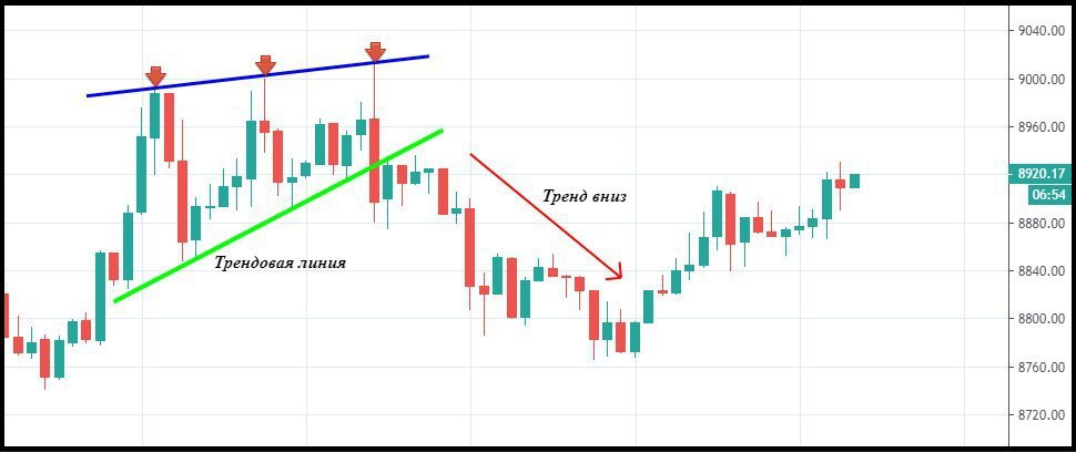 Обратимся к скриншоту. Здесь нарисована классическая трендовая линия, указывающая на восходящее движение. Цена несколько раз касается этой линии поддержки прежде, чем пробьет ее и тенденция на рынке поменяется. В нашем случае, после пробоя линии произошел его ретест и цена продолжила падение.