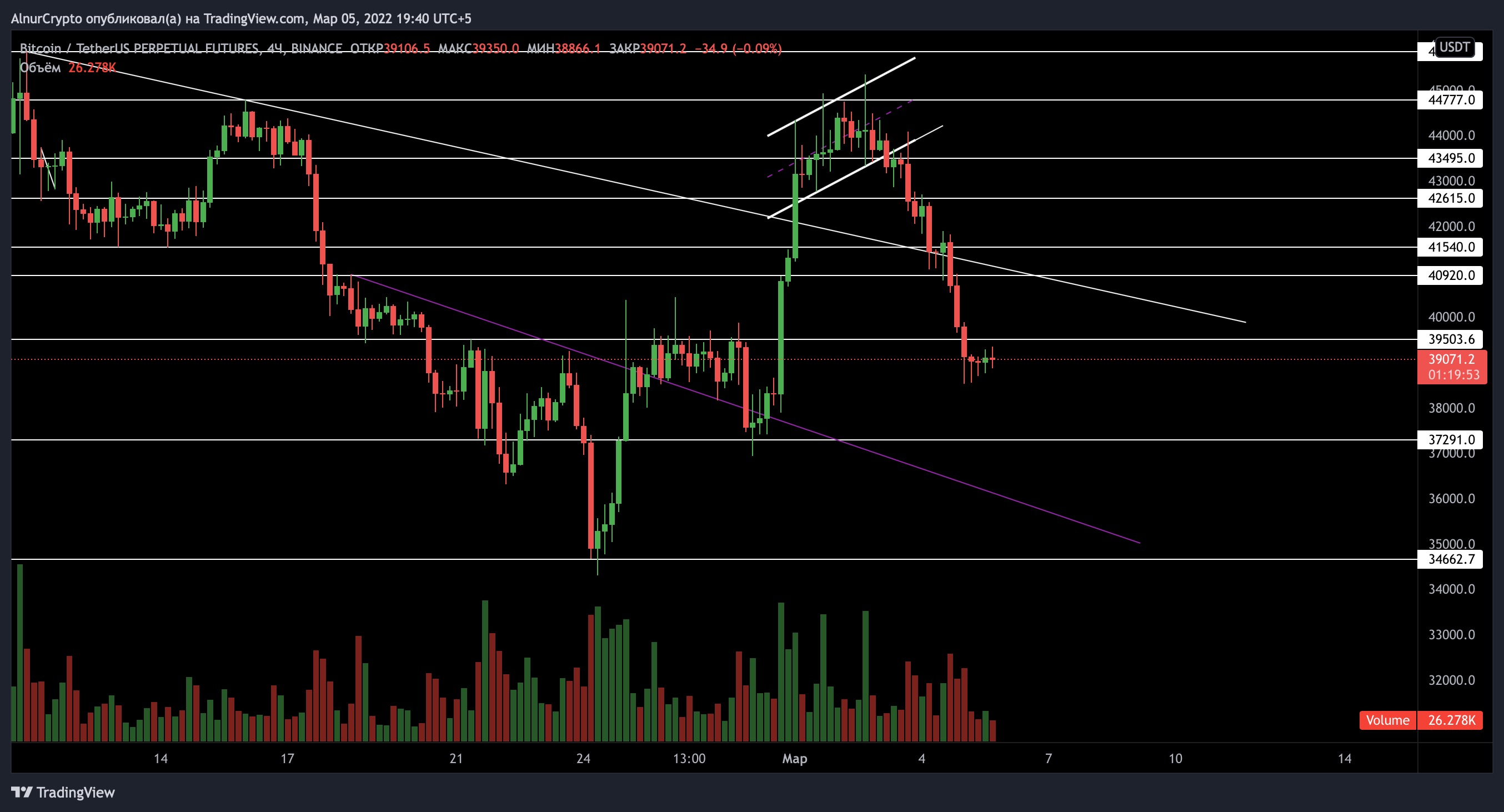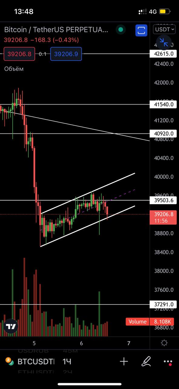 С прошлого анализа ничего не поменялось, так же находимся в рамках треуголльника. Если так же будем поджиматься к 39500$, то скорее всего его и пробъем. Опять же гадать в каком направлении выйдем из треугольника смысла нет.