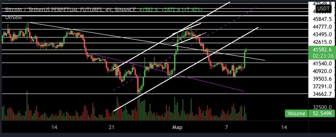 Подправил немного треугольник, теперь поддержка кажется более точной. Сегодняшняя дневка может закрыться пин-баром, это может привести к хорошему росту к верхней границе 42500-43500$. Вот теперь картина хоть немного ясна.
