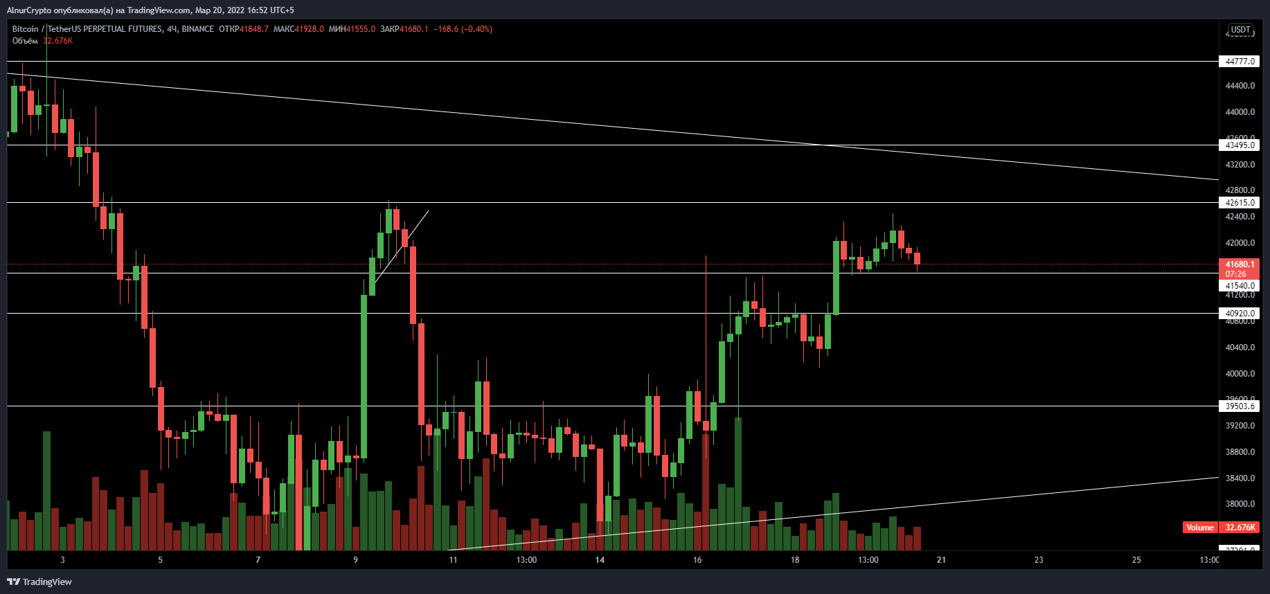 41500$ пробили, тренд локально-восходящий. Закреп над 42600$ даст пробой треугольника вверх и рост к дальнейшим сопротивлениям.