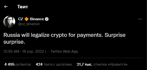 🤔 Россия легализует криптовалюты как платежное средство - Твит CEO Binance