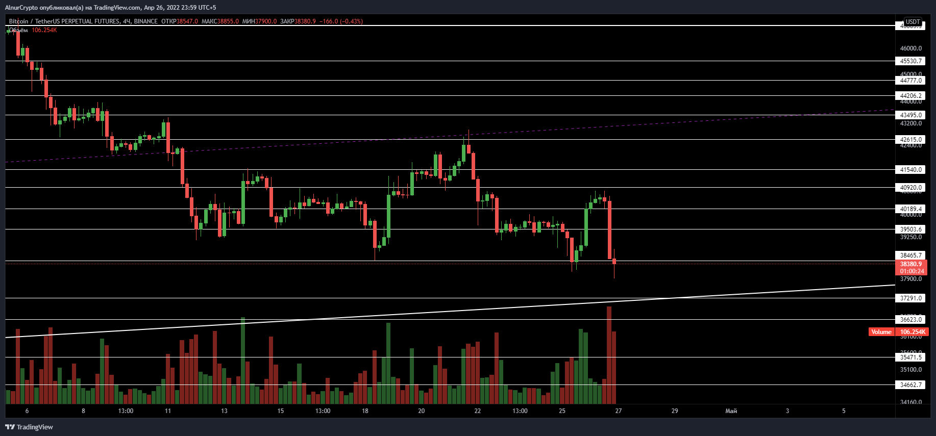 По $BTC ситуация не в пользу лонгов. Видна яркая доминация медведей над быками. Вчерашний рост сегодня же перекрыли, а лой обновили. Поддержка 37300$ - держит нас от сильнейшего падения, закреп под ним означает падение.