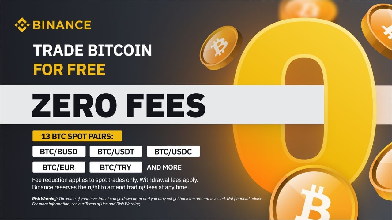 Криптовалютная биржа Binance уберет комиссионные сборы для 13 торговых пар с биткоином, включая BTC/USDT, BTC/BUSD, BTC/USDC.