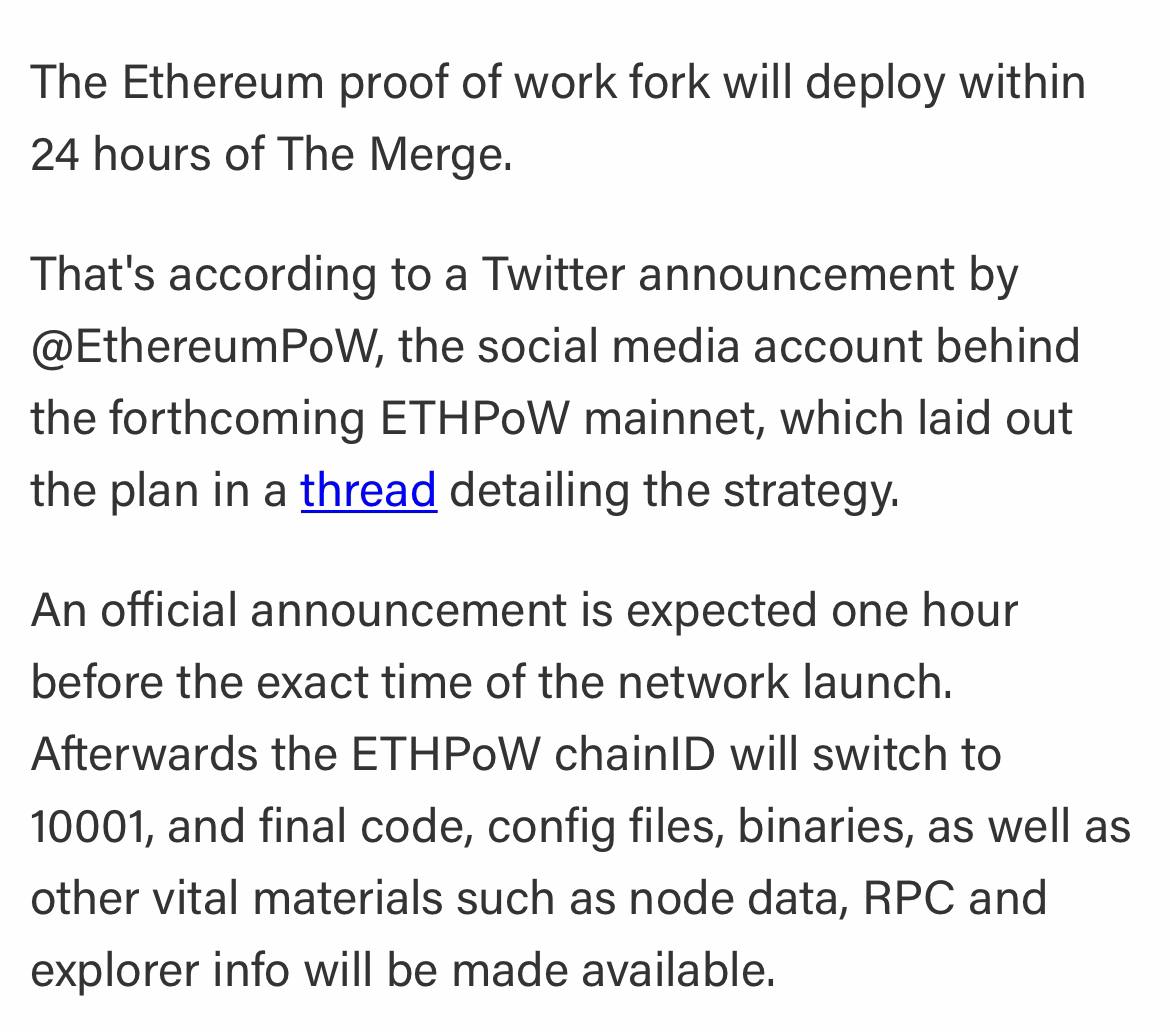 Запуск сети PoW форка эфира состоится в течение 24 часов после слияния 🙂
