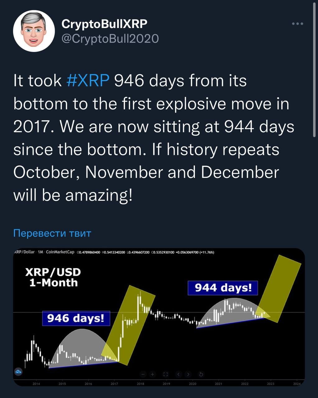 "XRP потребовалось 946 дней, чтобы стартовать в 2017-м со дна. Сейчас с момента дна прошло 944 дня. Если история повторится, октябрь, ноябрь и декабрь будут потрясающими!"