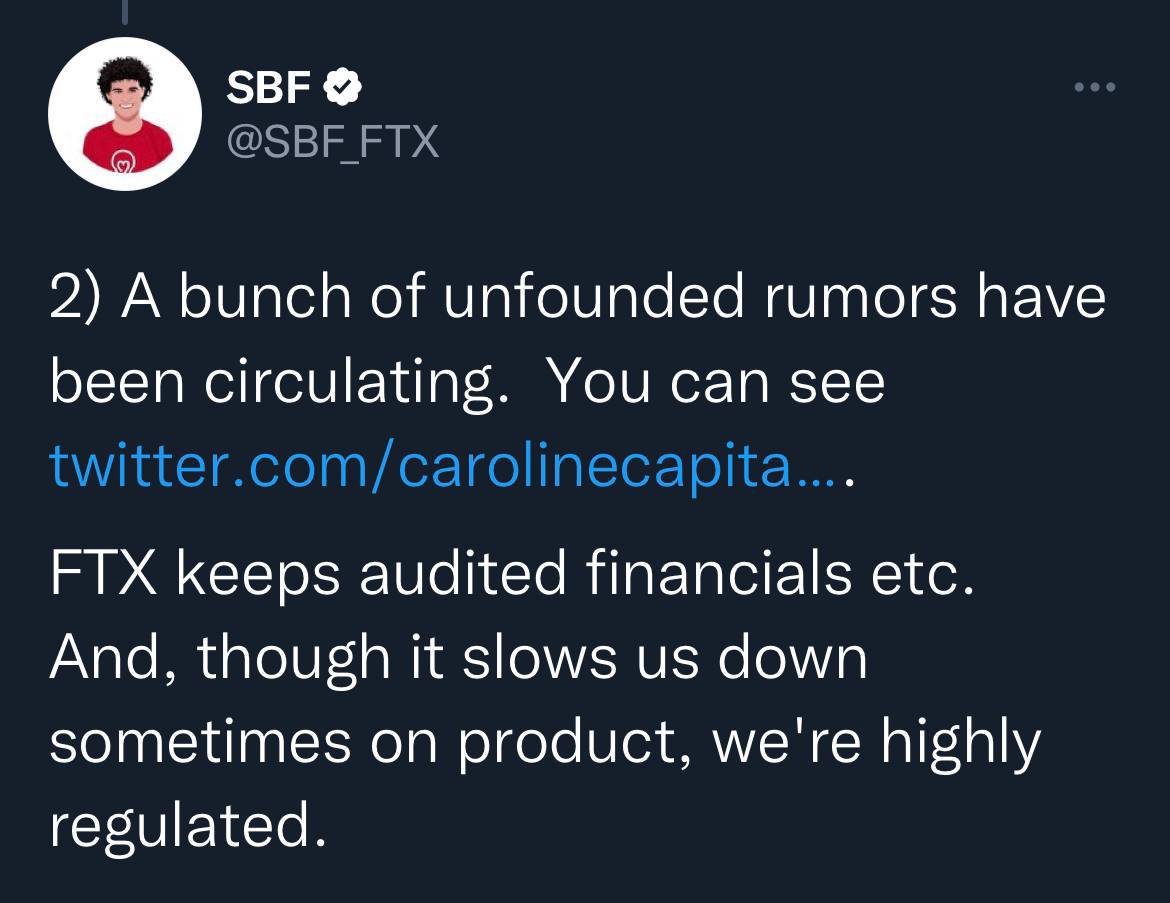 Просчитывая открытые транзакции, начало появляться много твитов, где начали сравнивать FTX с Луной или Celsius. На основе претензий в том, что FTX имеет кредиты под обеспечение своего же токена + FTX самый крупный холдер Solana А далее уже «залетает» CZ…