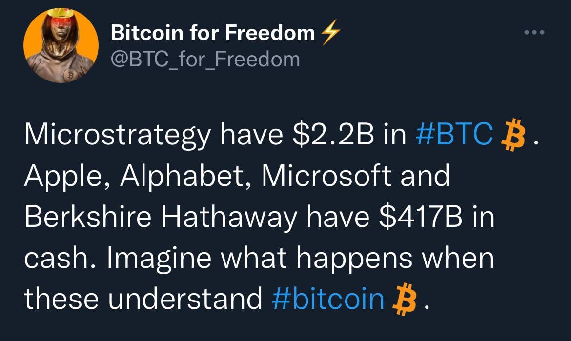 Apple, Alphabet, Microsoft и Berkshire Hathaway имеют 417 миллиардов долларов наличными. Представьте, что произойдет, когда они поймут, что такое биткоин...