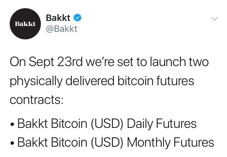 Bakkt сообщает что 23 сентября планируется запуск именно ежедневных и ежемесячных физически поставленных фьючерсов на биткойн