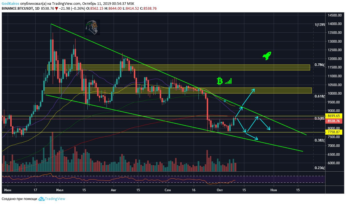 Глобально на дневке образовали клин, где при закрепе над 8700 откроется дорога к тесту верхней границы у 9100. Если же не закрепимся, то вероятно нас ждет флет и возможный откат к 7800, где при пробое этой границы отправимся к отметкам 7500-7000