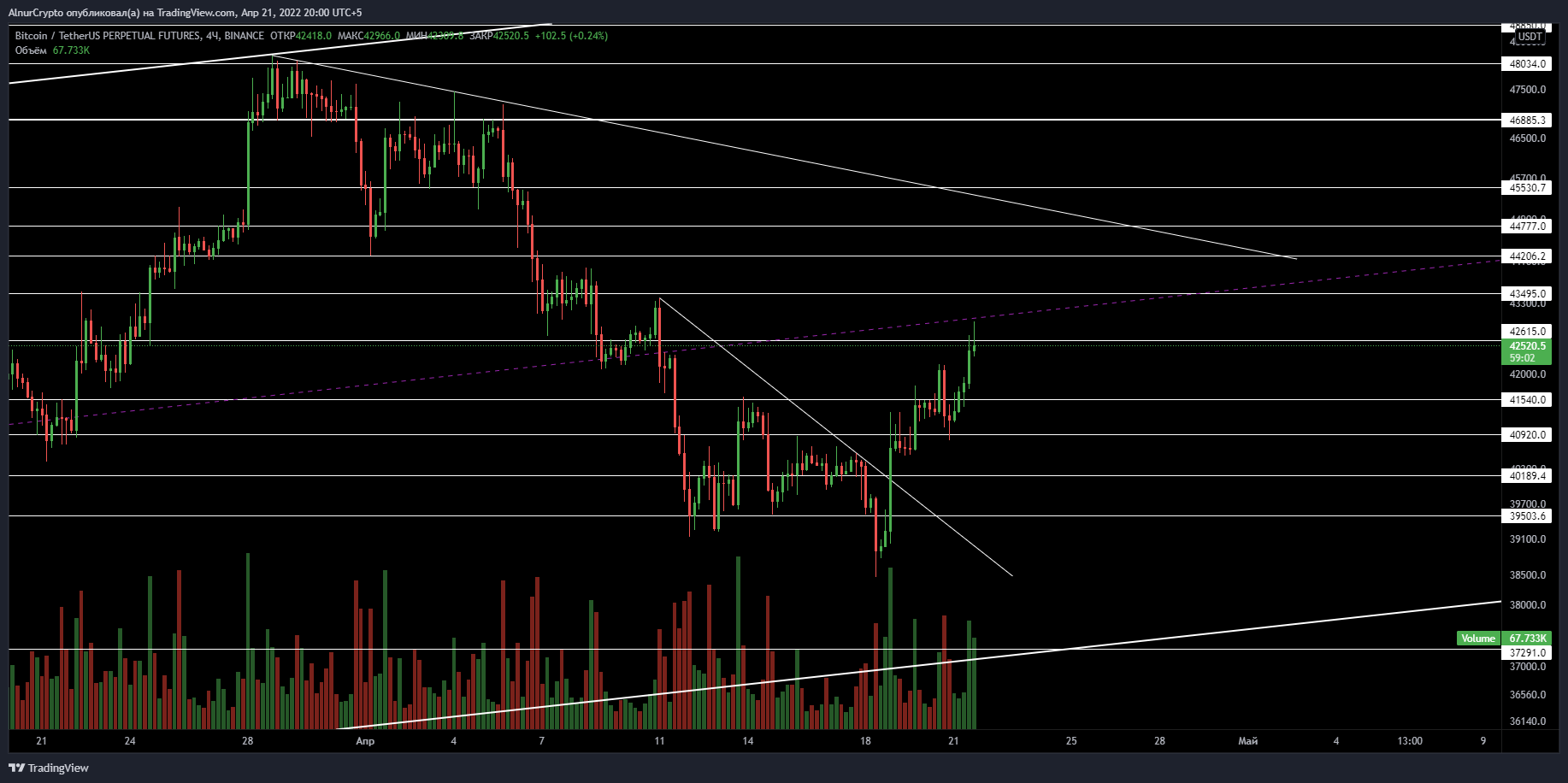 Вот и вырвался биток вверх (хай на данный момент 43к), встретили первое сопротивление 42600. Для 44-45 нужно пройти и закрепить блок 42600-43500$, и уже можно свободно идти на уровни выше.