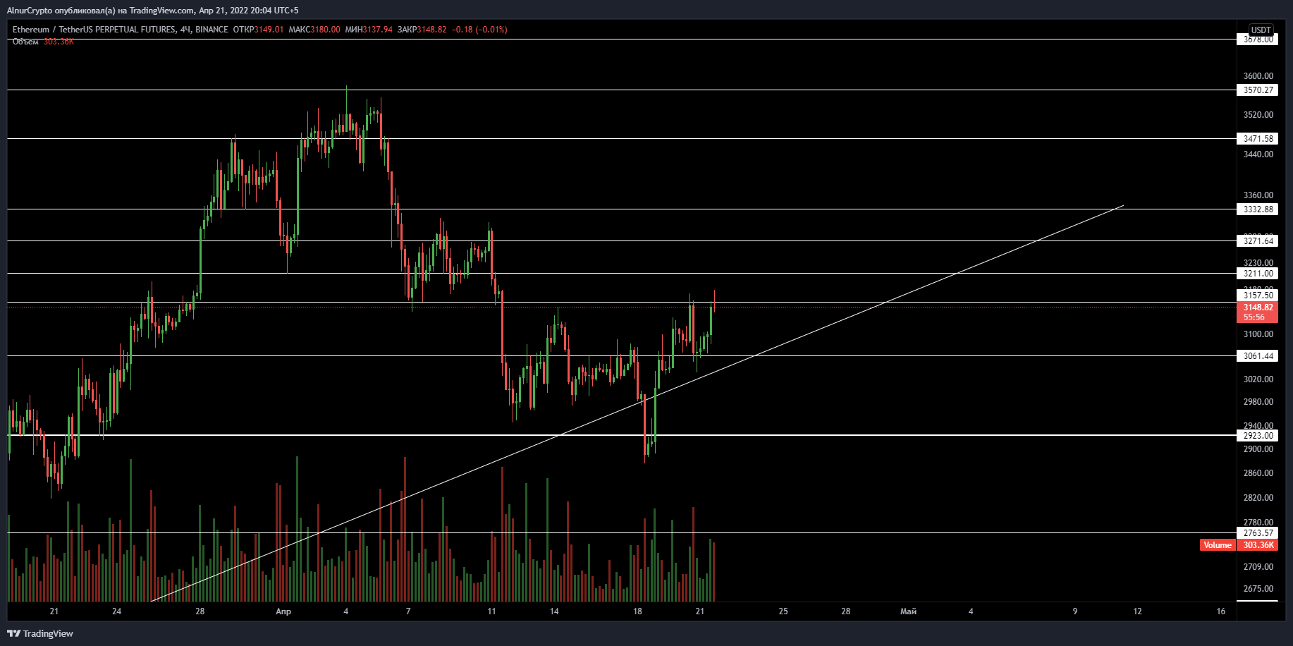 А вот $ETH желательно быстрее проходить и закреплять зеркальный уровень 3160$ для отличного роста, это и есть ближайшее сопротивление.