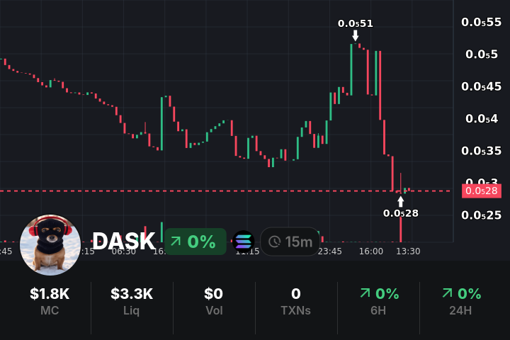 MCAP: $20.39K (+444.22%) | 24H VOL: $167.15K | Real-time trading data and liquidity info for dogwifmask (DASK) on SOL blockchain. Get insights on the latest price, volume, and market cap.