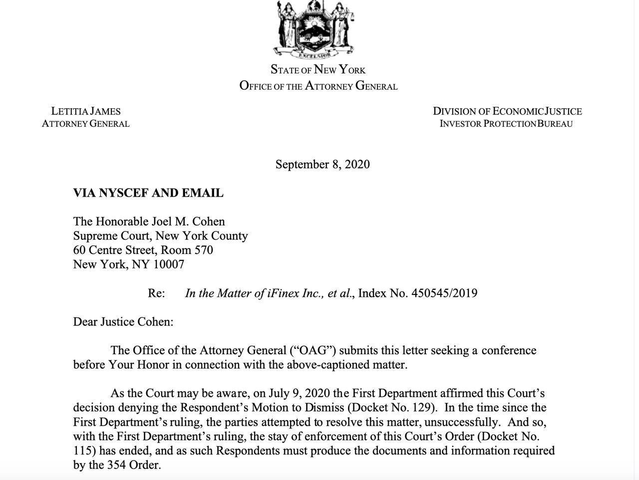 Генеральная прокуратура Нью-Йорка (NYAG) хочет, чтобы Tether и Bitfinex немедленно передали документы, детализирующие кредитную линию на 900 миллионов долларов, которую Tether предоставил Bitfinex.