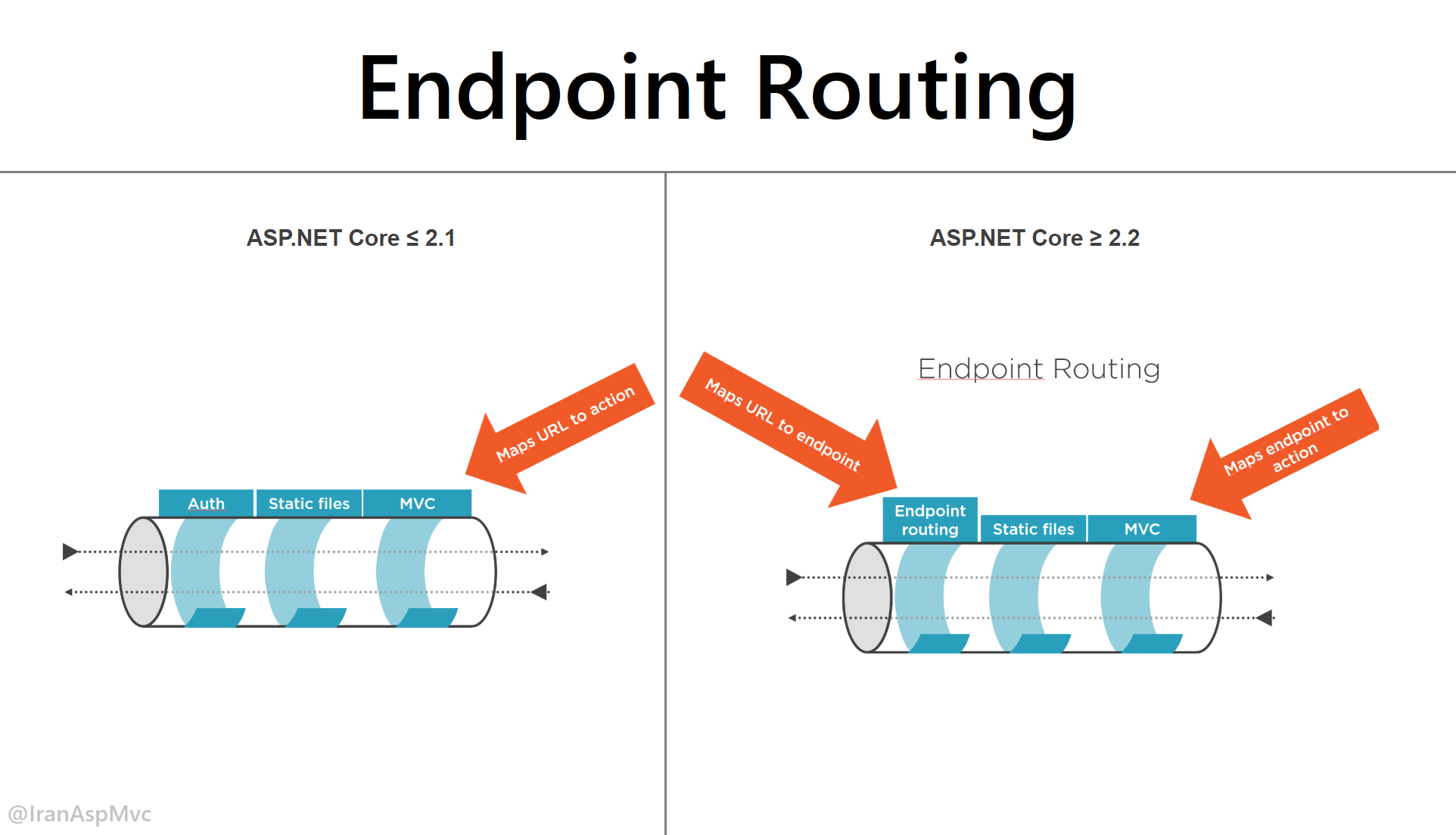 🔹 توی مکانیزم Endpoint Routing اما، وقتی یه درخواست میاد، همون ابتدا مشخص میشه که به کدوم Route مپ شده درنتیجه بقیه میدلور های قبل از میدلور MVC هم میتونن از سیستم Routing استفاده کرده و اطلاعات داخل Url رو درک کنن