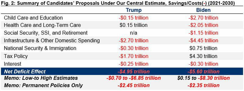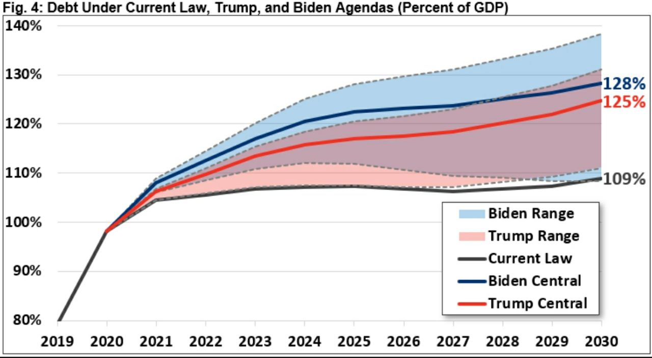 Согласно нашей основной оценке, оба плана существенно увеличат долг. В частности, мы находим, что план Трампа добавит к долгу $4.95 трлн в бюджетном окне с 2021 по 2030 г. План Байдена добавит 5.60 трлн"