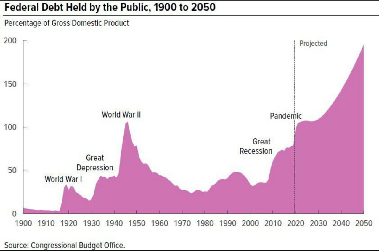 На графике внизу, рост федерального долга с 1900 г. С 2020 года прогноз Бюджетного управления Конгресса (CBO) по ускорению роста госдолга c 2021 г до 2050 г