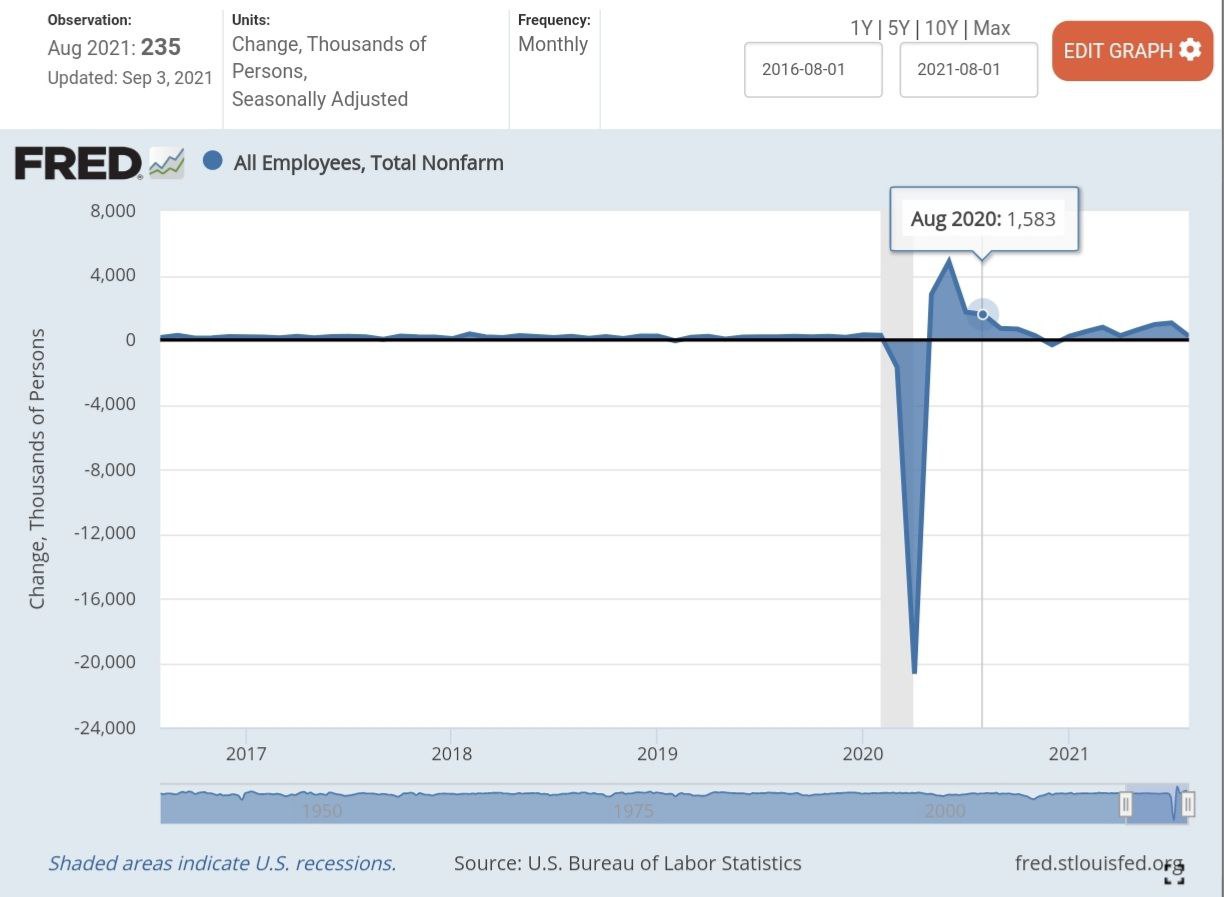 Общее количество рабочих мест вне сельского хозяйства увеличилось на 235,000 в августе после увеличения на 1.1 миллиона в июле. Занятость вне сельского хозяйства снизилась на 5.3 миллиона человек, или на 3.5%, по сравнению с уровнем до пандемии в феврале 2020 г