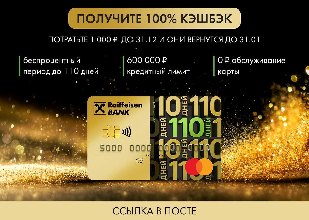 🔥 Лучший вариант оформления кредитной карты 110 дней Райффайзенбанка — по новой акции 100% кэшбэк за покупки на 1 000₽