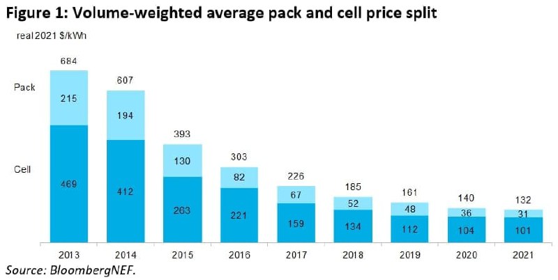 Средневзвешенные по отрасли цены упали до 132 долларов США за кВтч. Речь идёт об укомплектованных батареях – аккумуляторных блоках (battery packs), а не об элементах. В то же время цены на элементы ячейки составляют в среднем 101 доллар за кВтч.