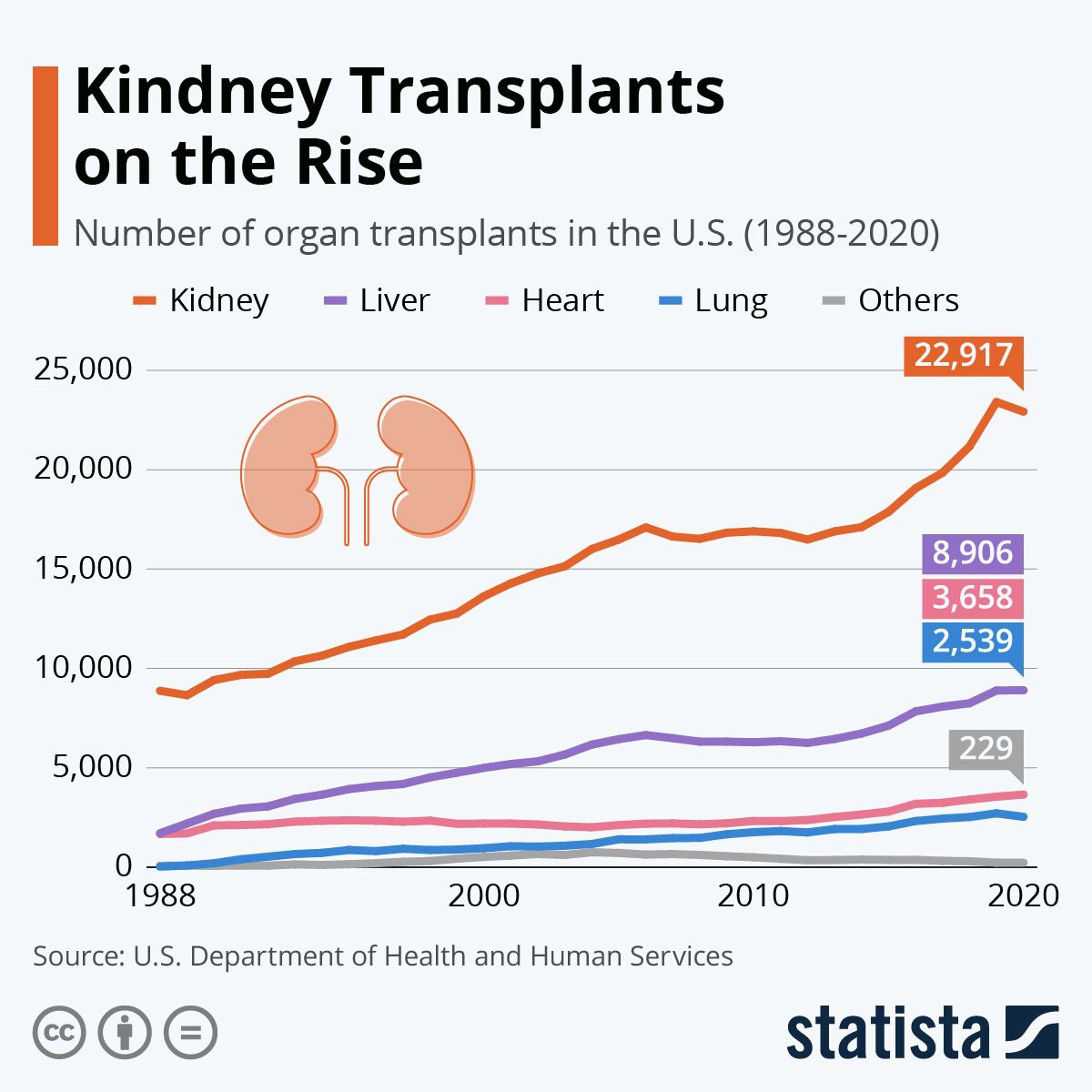 Почка была самым востребованным органом для пересадки, более 97 тыс на сегодняшний день. С конца 1980-х годов число трансплантаций этого органа увеличилось более чем вдвое. Для почки, как и для печени, донорами являются как умершие, так и живые пациенты, поэтому количество трансплантаций этих органов выше, чем сердца и легких