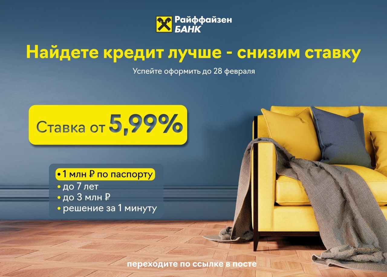 Райффайзенбанка. Банк даже готов снизить ставку, если вы найдете кредит выгоднее при оформление кредита до 28.02.2022!