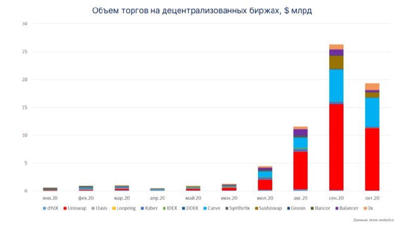 🕹Оборот децентрализованных бирж в октябре составил $19,35 млрд, что на 26% ниже рекордных показателей сентября ($25,8 млрд), однако в сравнении с августом показатель вырос на 66%.
