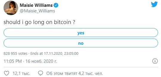 🧟♂️760 тыс. человек приняли участие в опросе звезды "Игры престолов" о битокине. "Арья Старк" (актриса Мэйси Уильямс) поинтересовалась у подписчиков в Twitter, стоит ли ей покупать первую криптовалюту. Больше половины опрошенных ответили отрицательно.