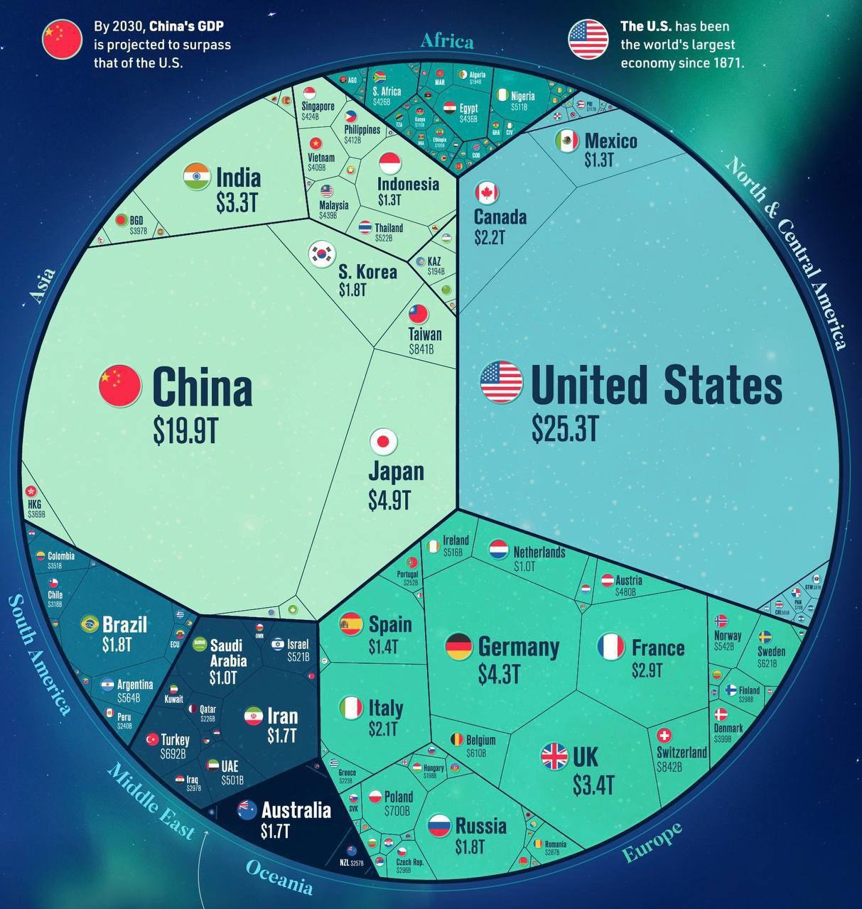США по-прежнему являются мировым экономическим лидером (с 1871 г.) с ВВП в $25,3 трлн, что составляет почти четверть мировой экономики. Китай следует за ним с $19,9 трлн.