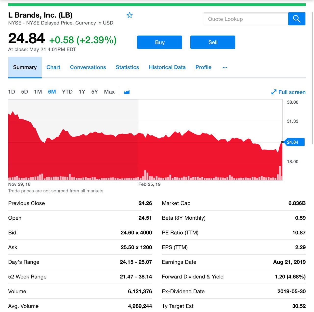 L Brands (LB), снизились на 2,9% за 2019 и более чем на 29% за прошлый год. Компания сообщила, что прибыль 1-ого кв. превысила ожидаемый уровень в 14 центов на акцию, что значительно выше прогноза. При этом продажи в магазинах Victoria's Secret упали на 5%, однако подскочили на 13% в Bath&Body Works.