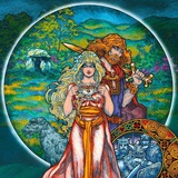 St. Brigid portrayed as a striking woman in robes of royal blue with golden embroidery - Harry Clarke, Geneva Window.